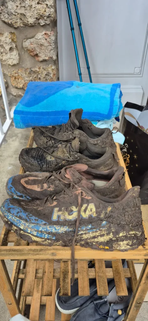 J’etais bien, très bien au départ de la course. Bon rythme, bonnes sensations et 12ème au ravitaillement du 30ème kms. Mais les galères sont ensuite arrivées (à partir du 35eme). Chaussures pas adaptées, terrain chaotique  avec la boue, chute sur chute, déshydratation au 40eme 😪. Et j’avais l’impression de courir en permanence sur une patinoire, toujours à glisser et lutter pour ne pas tomber.